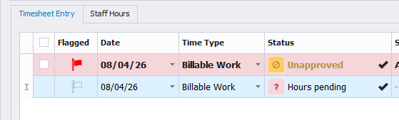 - A timesheet can now be "flagged" (small flag icon on left, much like an Outlook email), which can also be done from admin or the latest version of the mobile app by staff. The idea is if there is a complication or further admin assistance required, staff can flag this and convey it in the description then it is highlighted later for admin staff intervention.