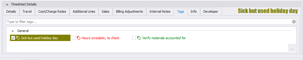 - Timesheets can now have tags ("tags" tab at bottom) and so be filtered by tag too. This can let you categorise timesheets by customisable tags to extend functionality. Desktop only currently.